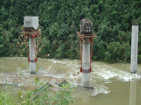 7月5日晚,持續(xù)強降雨引發(fā)山洪,黃祁高速十二標境內(nèi)櫓溪河河水猛漲,導(dǎo)致大北埠1號、2號、3號大橋施工便道被洪水沖毀,其余施工路段均不同程度受到影響,生產(chǎn)及生活設(shè)施嚴重受損。
