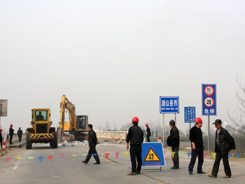 2013年3月9日上午9點,由安慶市公路工程處承建施工的318國道潛山車軸寺大橋?qū)嵭腥忾]交通管制,占新文等處領(lǐng)導(dǎo)陪同潛山縣公路局領(lǐng)導(dǎo)一行到現(xiàn)場察看情況。