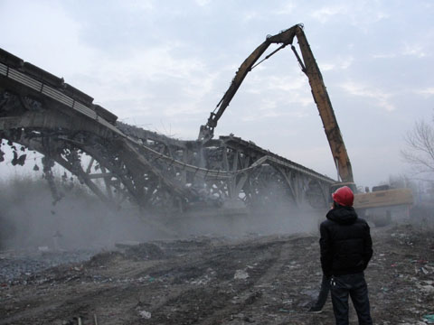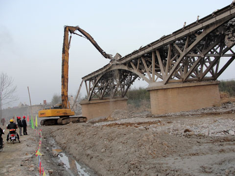 由于該橋?qū)儆谖颍鸪y度大,河床和橋梁結(jié)構(gòu)比較復(fù)雜,鑒于現(xiàn)場(chǎng)實(shí)際情況和對(duì)拆除安全的重要性,我處采用國(guó)內(nèi)目前最先進(jìn)的大型拆除設(shè)備——自動(dòng)液壓鉗進(jìn)行現(xiàn)場(chǎng)拆除,并成立大橋拆除應(yīng)急預(yù)案小組及安全領(lǐng)導(dǎo)小組確保此次拆橋順利完成。