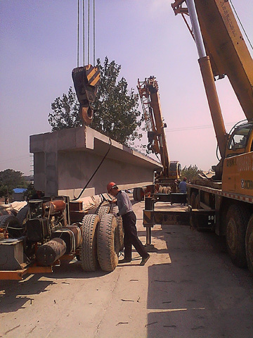 橫埠河大橋位于S103線(xiàn)樅陽(yáng)縣境內(nèi)。全長(zhǎng)188.56米,橋面正寬12米,上部結(jié)構(gòu)采用9跨20米預(yù)應(yīng)力混凝土T梁,每跨6片,全橋梁板共計(jì)54片。自8月24日開(kāi)始第一片梁架設(shè)后,項(xiàng)目部克服重重困難,精心組織,合理安排,確保了大橋吊裝的順利合龍。