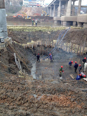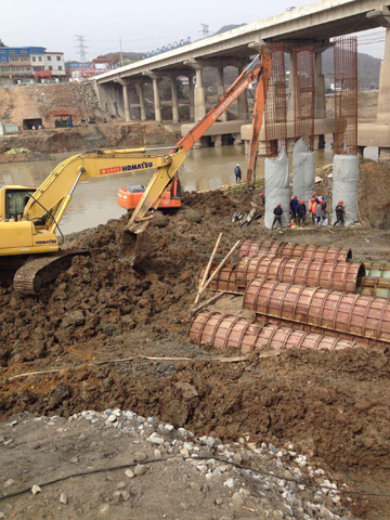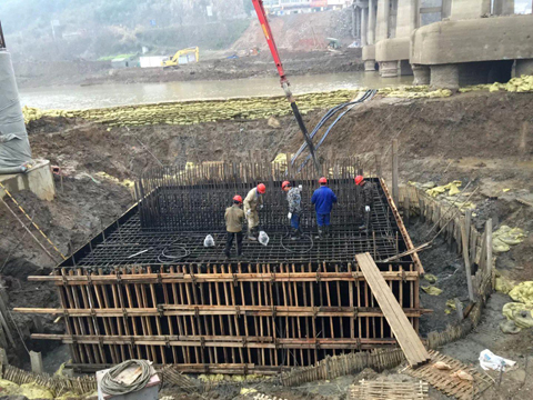 自春節(jié)以來,連日陰雨,石門湖水位迅速上漲。為趕在汛期來臨前,確保主墩躍出水面,公路工程處獅子口大橋項(xiàng)目部精心組織策劃,加大投入;項(xiàng)目部全員參與,全過程盯守;處領(lǐng)導(dǎo)深入一線,指導(dǎo)工作;施工班組日夜倒班,工作面上24小時(shí)不間斷作業(yè)。項(xiàng)目各參建方集中全部施工力量,特調(diào)用加長臂挖機(jī)一臺,和時(shí)間賽跑,經(jīng)過4天3夜的連續(xù)作戰(zhàn),終于在3月8日晚21時(shí)許,成功完成了4#主墩承臺的開挖、圍堰、抽水、鋼筋綁扎、立模、澆注等工作。共制作與安裝鋼筋20.1噸,連續(xù)澆注混凝土191立方米,創(chuàng)造了承臺施工的新速度。為本項(xiàng)目一個(gè)重要節(jié)點(diǎn)“4月份汛期來臨前,主墩躍出水面”創(chuàng)造了有利條件,同時(shí)也為“12月底前,大橋通車”打下了堅(jiān)實(shí)的基礎(chǔ)。