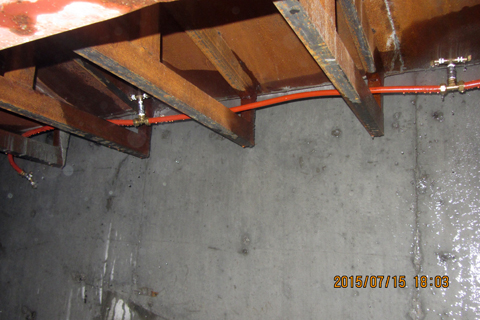 自7月13日進入初伏天以來,氣溫隨即攀升,高溫時節(jié)已到來,給主橋掛籃懸澆箱梁施工的養(yǎng)護工作帶來了困難,僅靠人工灑水已達不到養(yǎng)護要求。經(jīng)項目部組織到中交二航局承建的皖河大橋參觀、學(xué)習(xí)和借鑒施工經(jīng)驗,在主橋掛籃懸澆施工中采用噴淋養(yǎng)護工藝,對箱梁進行全方位的系統(tǒng)養(yǎng)護。使施工成品得到了及時、全覆蓋的養(yǎng)護,提升了懸澆箱梁的成品質(zhì)量。