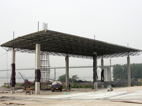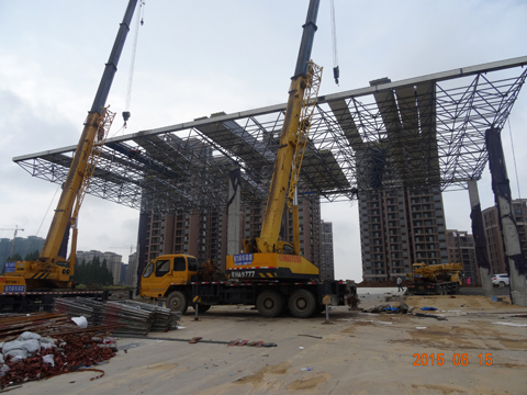 8月15日下午,G206東門汽車碼頭的罩棚網(wǎng)架結(jié)構(gòu)工程在四臺起重機(jī)的轟鳴聲中順利完成吊裝。