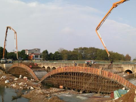 11月18日,在各方的大力支持與配合以及項(xiàng)目部人員的不懈努力下,高河大橋右幅兩跨主拱圈順利澆筑完成。G206懷寧縣高河大橋,主拱圈拱軸線為懸鏈線無(wú)鉸拱,計(jì)算跨徑30.0米,矢跨比1/6,拱肋截面為實(shí)腹式,肋厚1.0米,主拱圈寬6.53米,采用鋼筋混凝土結(jié)構(gòu),施工工藝復(fù)雜。